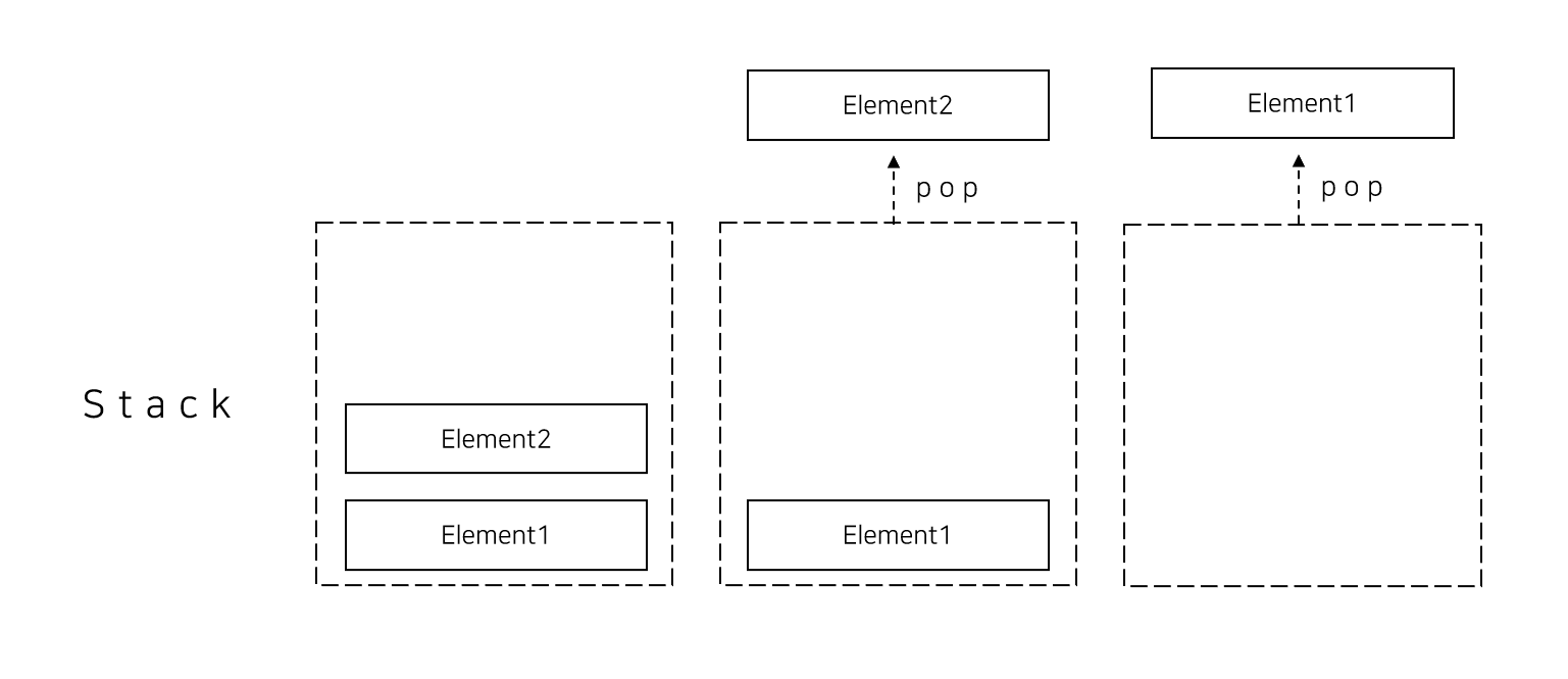 pop 연산은 stack에서 값을 빼내는 연산이다. LIFO 구조이므로, 마지막에 들어간 값이 먼저 나온다. 만약에 빈 stack에 pop연산을 하게 되면 EmptyStackException이 나온다.