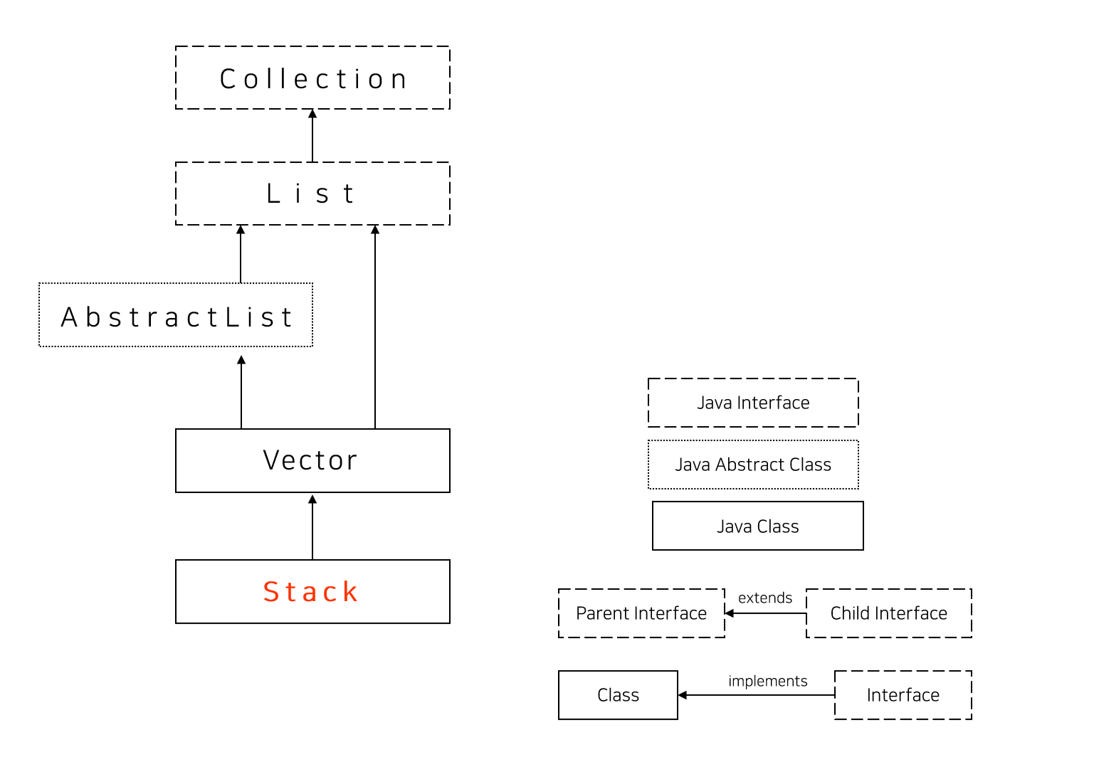Kotlin에서는 Stack을 사용하기 위에 JCF의 Stack을 가져와 사용한다. Stack의 상속구조는 조금 복잡해서 List 위쪽(List가 확장하는 인터페이스)은 간소하게 표현했다.