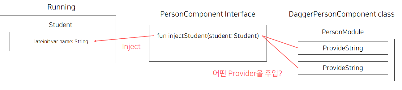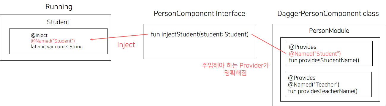 제공(Provider)하는 쪽의 fun과 주입받은 Student 에 모두 @Named 를 붙임으로써 Student가 어떤 Provider로부터 name 프로퍼티를 주입 받아야 하는지가 명확해졌다.
