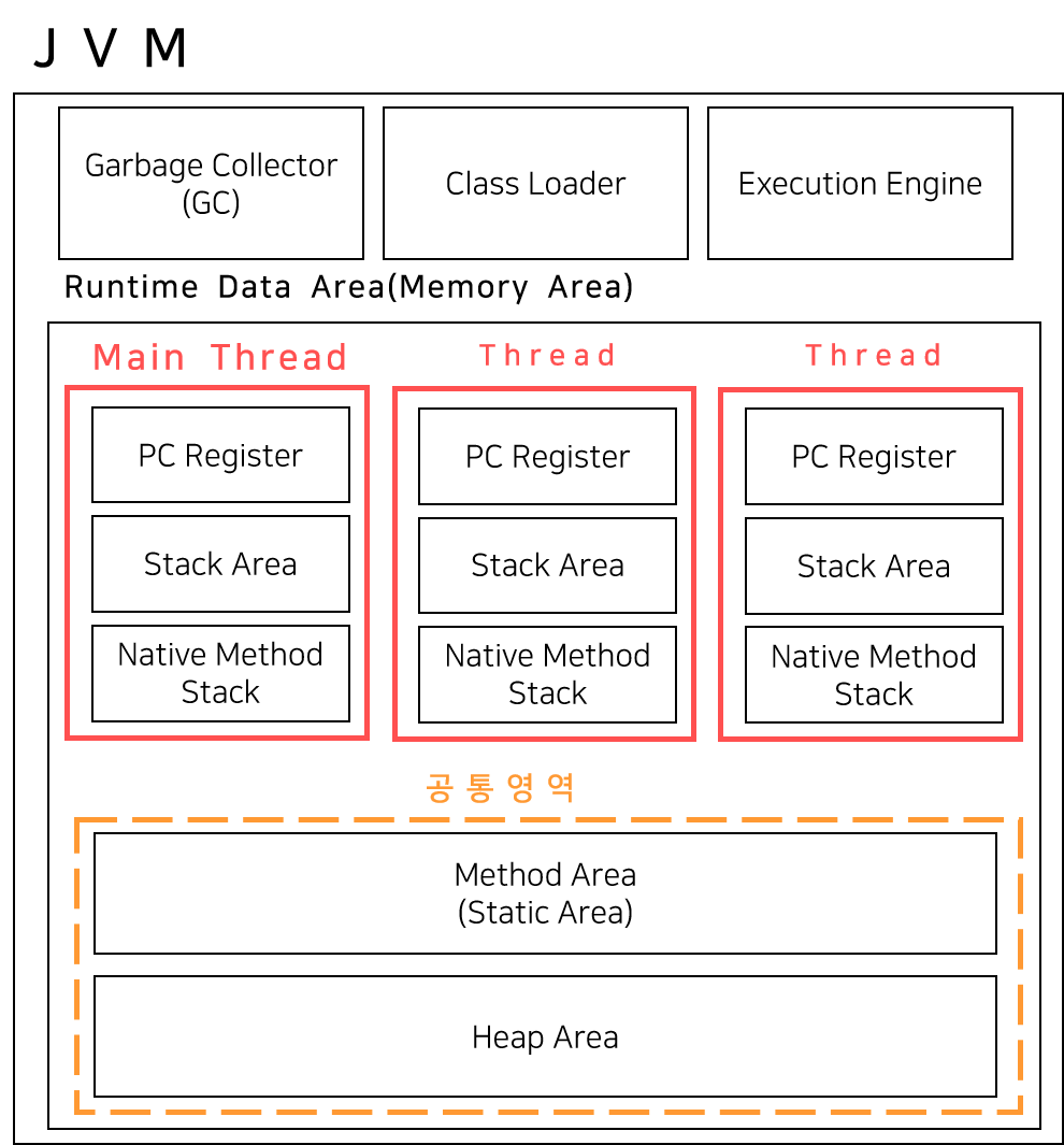 그림1의 메인 스레드(Main Thread)를 보자. JVM프로세스는 메인 스레드가 main 함수를 실행하며 시작되며, 만약 프로세스 내에 사용자 스레드가 메인 스레드 밖에 없는 상황에서는 메인 스레드가 종료되면 프로세스 또한 강제로 종료되는 특성을 가진다. 이때 메인 스레드는 한 번에 하나의 작업을 실행 가능하다.