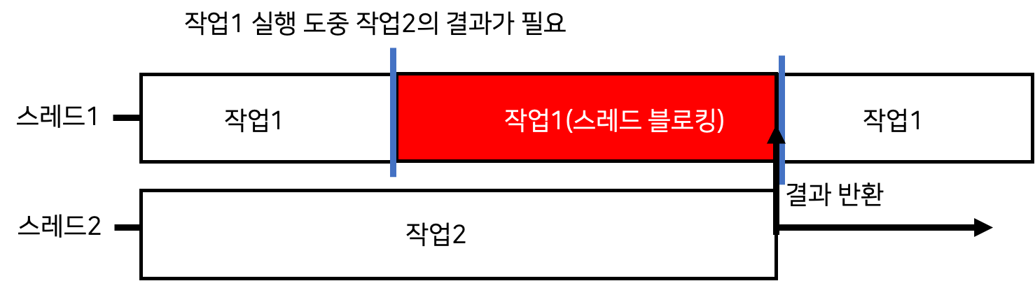 위의 그림3을 보면 스레드1에서 작업1 수행 도중 스레드2의 작업2의 결과물이 작업1을 수행하는데 필요해졌다. 그때 작업1을 실행하던 스레드1은 아무것도 하는일 없이 블로킹되며 스레드2로부터 결과를 전달받아 작업1을 재개하기 까지 많은 시간이 소요된다. 이렇게 짧은 시간동안만 블로킹되면 다행이지만, 실제 상황에서는 스레드의 성능을 반도 발휘하지 못하게 만드는 블로킹이 반복될 수 있다.