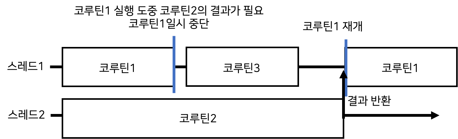 1. 코루틴1이 생성돼 스레드1에 실행 요청되고, 코루틴2가 생성돼 스레드2에 실행 요청된다. 스레드1에서 코루틴1 실행 도중 나머지 연산에 코루틴2로부터의 결과가 필요해진다. 하지만, 코루틴2의 작업이 끝나지 않아 코루틴1의 작업을 마저할 수 없다. 이때 코루틴1은 스레드1을 블로킹 하는 대신 사용 권한을 양보하고 다른 코루틴이 스레드 위에서 실행될 수 있도록 한다.