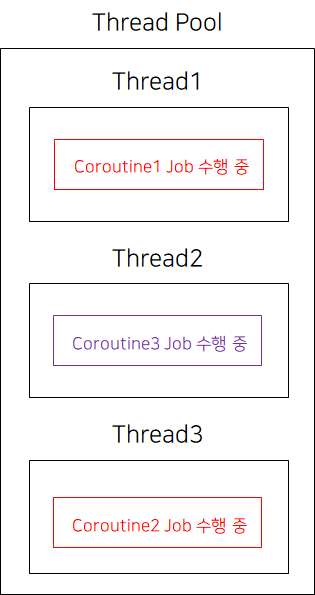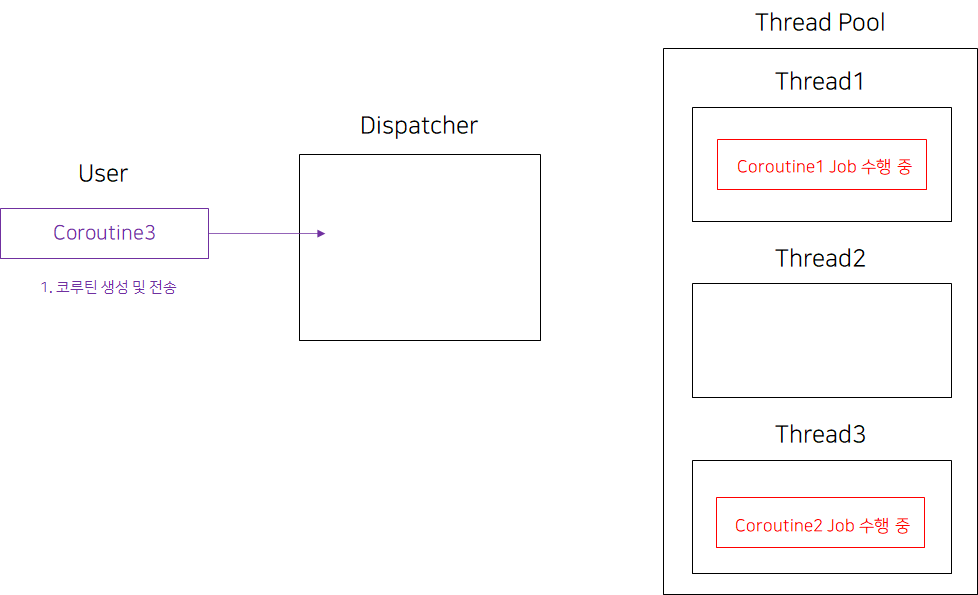 우리가 코루틴을 만들어 CoroutineDispatcher로 코루틴의 실행을 요청하면, CoroutineDispatcher은 자신이 사용할 수 있는 스레드풀의 스레드 중 하나에 코루틴을 보낸다. 이 때 CoroutineDispatcher은 자신이 사용할 수 있는 스레드 풀 내의 스레드 부하 상황에 맞춰 코루틴을 분배한다. 이를 시각적으로 표현하면 다음과 같다.