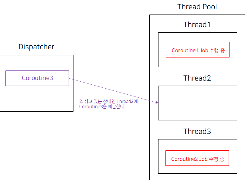 2. CoroutineDispatcher은 자신이 잡고 있는 스레드풀에서 사용할 수 있는 스레드가 어떤 스레드인지 확인한 후, 해당 스레드에 코루틴을 보낸다.