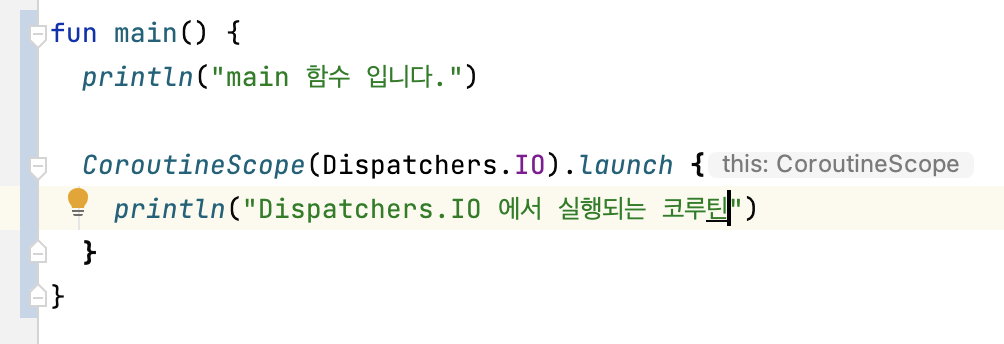 자 이제 그림2와 같은 코드를 실행해보자. 그림2에서는 Main Thread가 아닌 IO Thread에 코루틴을 실행 요청해 println 함수를 실행 하도록 만들었다.