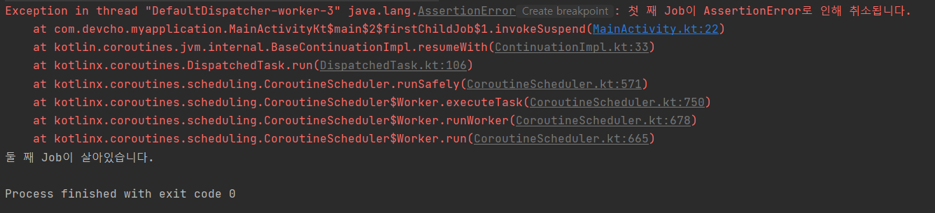 throw AssertionError("첫 째 Job이 AssertionError로 인해 취소됩니다.")