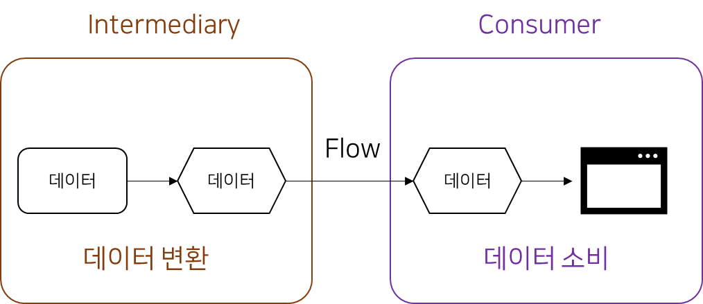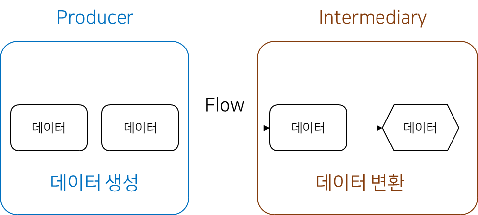 생산자가 데이터를 생성했으면 중간 연산자는 생성된 데이터를 수정한다. 여기서의 중간 연산자는 생산자가 생성한 데이터를 수정한다. 예를 들어 생성자는 A라는 객체로 이루어진 데이터를 발행했는데 우리는 B라는 객체 데이터가 필요한 경우 Flow에서 지원하는 중간 연산자를 이용해 A객체를 B객체로 바꿀 수 있다.