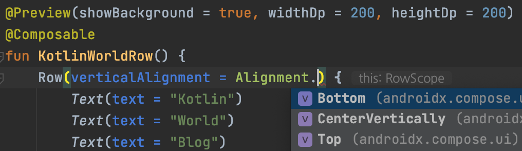 RowScope에는 @Composable 람다식이 들어가야 한다. 즉, 우리가 원하는 위젯들을 이 안에 넣을 수 있다. 즉 코드 상의 Text들은 RowScope.() -> Unit 타입을 가지는 람다식이라고 볼 수 있다.