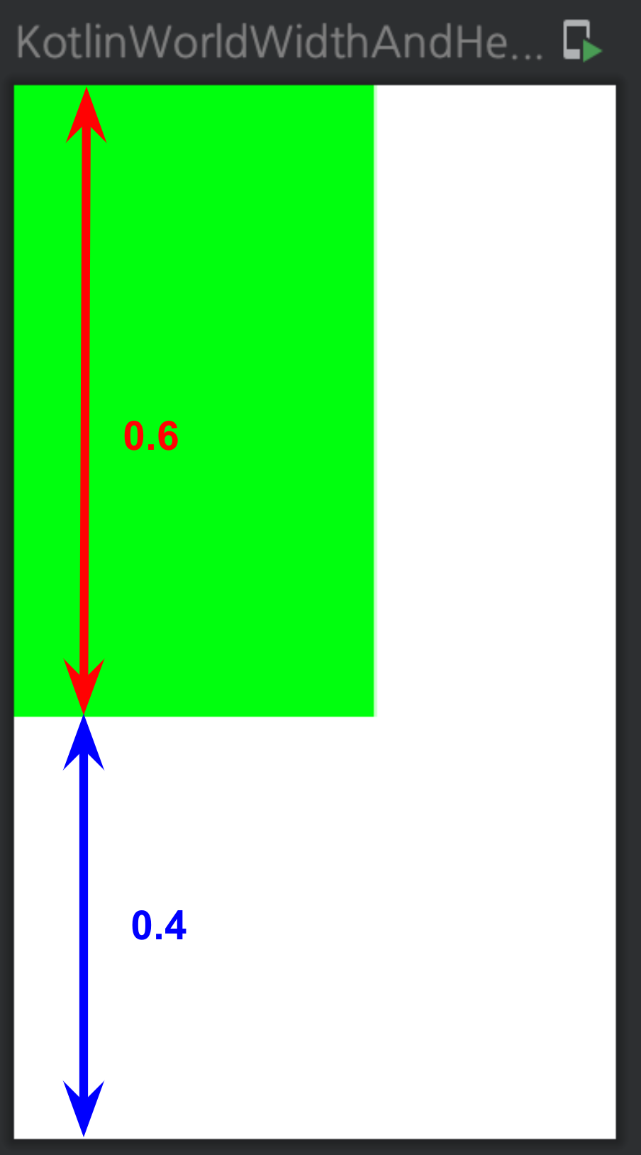 fillMaxSize의 fraction은 가로, 세로 비율을 모두 한 번에 조정한다. 위 그림7의 초록 사각형을 전체 비율의 0.6만큼만 채우도록 fraction에 0.6f를 파라미터로 넘겨보자.