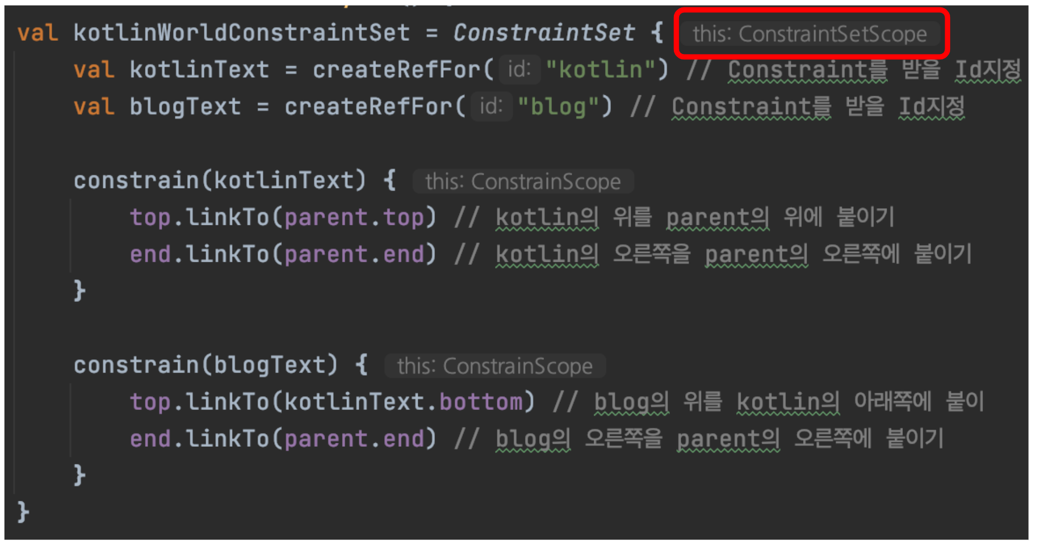top.linkTo(parent.top) // 3. ConstraintLayout(parent)의 bottom에 kotlinWorldText의 top을 놓기