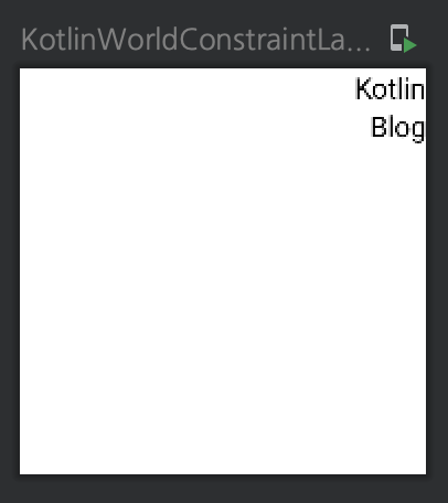 ConstraintLayout의 constraintSet parameter로 우리가 만든 kotlinWorldConstraintSet을 넘겼다. 이후 각 Text에 Id를 지정하였다. 위 코드에 대한 결과는 다음과 같다. Kotlin Text가 parent의 오른쪽 위에, Blog는 위는 Kotlin의 아래쪽에 오른쪽은 parent의 오른쪽에 붙은 것을 볼 수 있다.