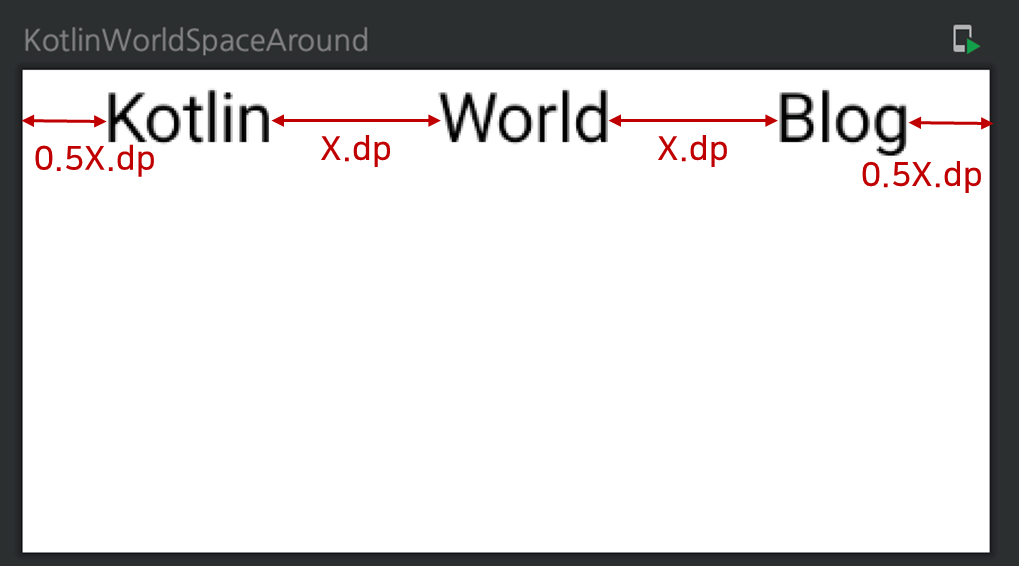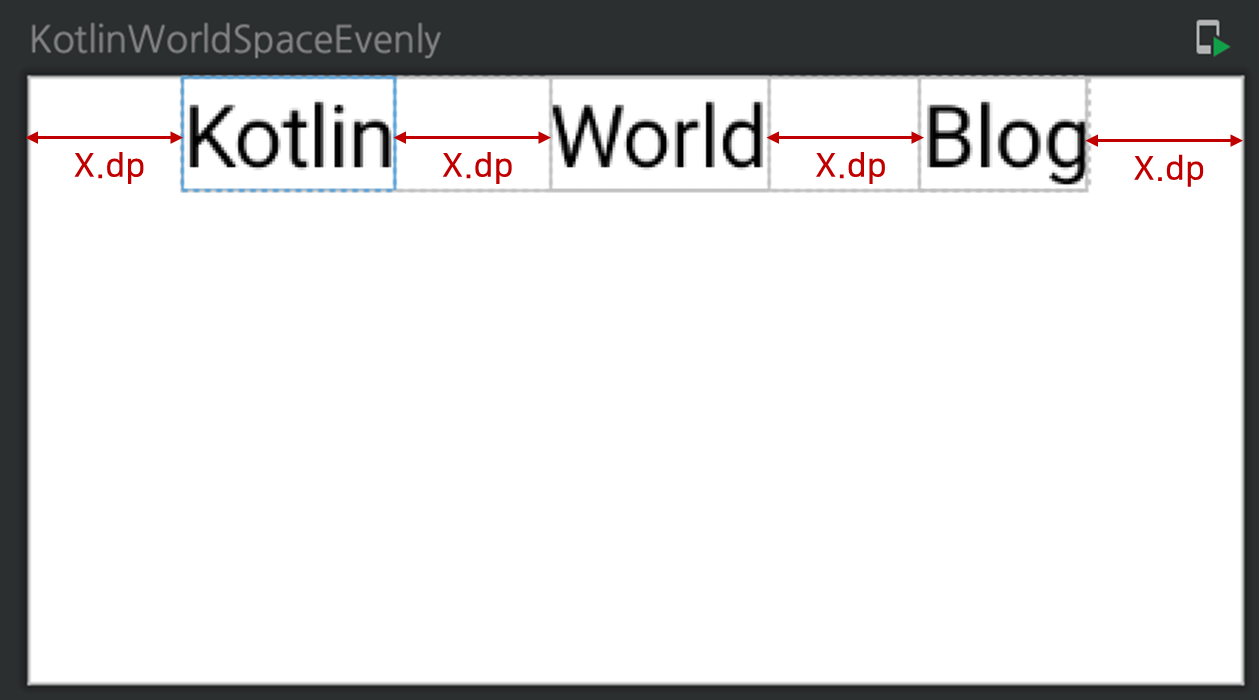 위의 Kotlin과 Blog가 양끝에 여유공간이 없이 붙어있는 것을 확인할 수 있으며 Compose 컴포넌트간의 간격이 동일한 것을 확인할 수 있다.