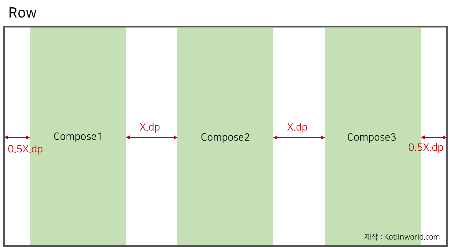 Compose의 Row와 Column에서 Arrangement의 인자값으로 넘길 수 있는 SpaceBetween, SpaceAround, SpaceEvenly는 컴포넌트를 배치(Arrangement)할 때 매우 유용하게 사용할 수 있는 옵션이다. 기본적으로 Space~이 들어간 옵션은 모두 컴포넌트들간의 간격을 동일하게 맞춰준다. 하지만 그 각각의 내부 동작이 다른데 어떻게 다른지 아래에서 살펴보도록하자.