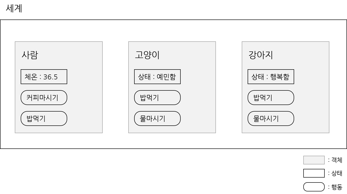 위 그림의 세계에는 사람, 고양이, 강아지가 있다. 이들은 모두 객체이며 이러한 객체들이 존재하는 세계를 프로그래밍을 통해 창조하는 것이 객체지향이다. 객체지향 언어를 사용하게 되면 수많은 객체 지향 세계를 창조하게 된다.