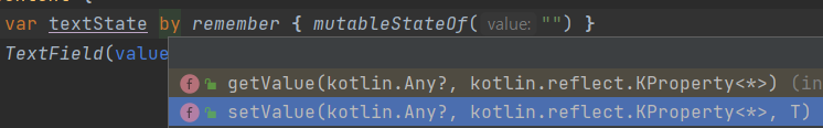 MutableState을 by키워드와 함께 쓰게 되면 textState에 getValue와 setValue에 대한 위임(Delegation)이 일어난다. 여기서 주의할 점은 하나의 값에서 setValue또한 일어나야 하기 때문에 val이 아닌 var을 써야한다는 점이다.