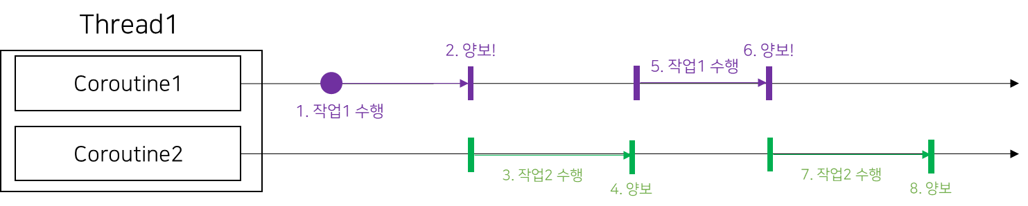 이는 서브루틴과는 다르다. 루틴 속의 서브루틴은 무조건 순차적으로 수행되어야 하지만 Coroutine은 함께 수행되며 서로 무제한 양보를 할 수 있다. 예를 들어 아래의 그림과 같이 Coroutine1과 Coroutine2는 여러번 양보를 수행하며 같이 수행될 수 있다. 이렇게 하면 스레드의 자원을 최대한 활용할 수 있어 최고이다.