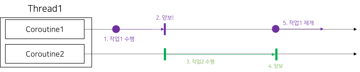 여기서 Coroutine1속에서 Coroutine2가 수행되는 것이 아니다. 각각은 서로 다른 함수(Routine)이며, 함께 수행되고 있다. 이들이 하나의 스레드를 점유하고 있을 때 한 Routine이 다른 Routine에게 Thread 점유 권한을 양보함으로써 함께 수행되는 것이다.
