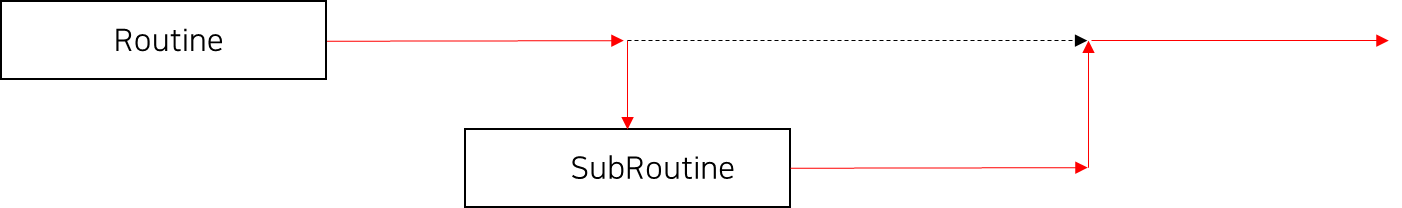 코드에서 routine1을 실행하면 routine2가 속에서 수행된다. 우리는 이러한 routine2를 routine1의 서브루틴이라 부른다. 즉, 서브로 실행되는 함수를 서브루틴이라 부르는 것이다. 서브루틴은 루틴에 대해 순차적으로 수행된다는 특징이 있다. 만약 루틴이 수행이 되지 않을 경우 서브루틴 또한 수행되지 않는 것이다.