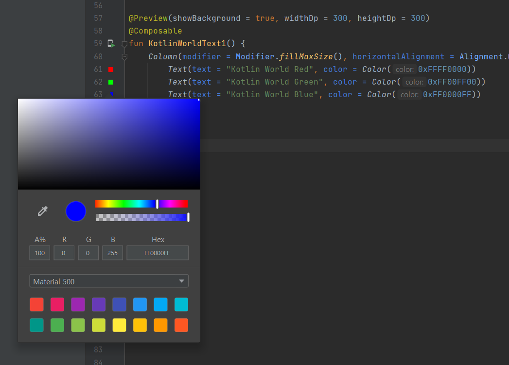 Text(text = "Kotlin World Blue", color = Color(0xFF0000FF))