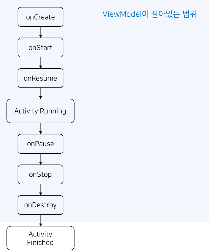 2번 방법은 효율적이다. 아래 그림의 ViewModel이 살아있는 범위에서 볼 수 있듯이 ViewModel은 onDestroy가 호출되더라도 살아있고 ViewModel에서 해당 데이터를 저장하고 있으면 되기 때문이다.