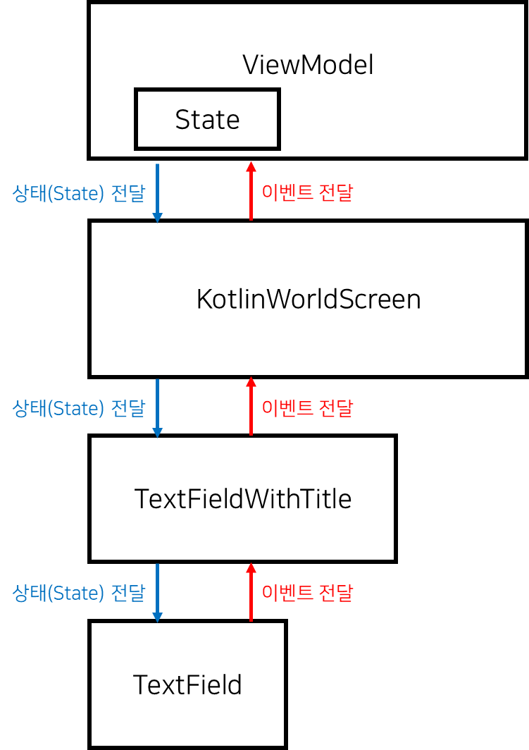 이렇게 하면 TextFieldWithTitle Composable은 Stateless해지고, Screen으로부터 상태를 전달 받는다.