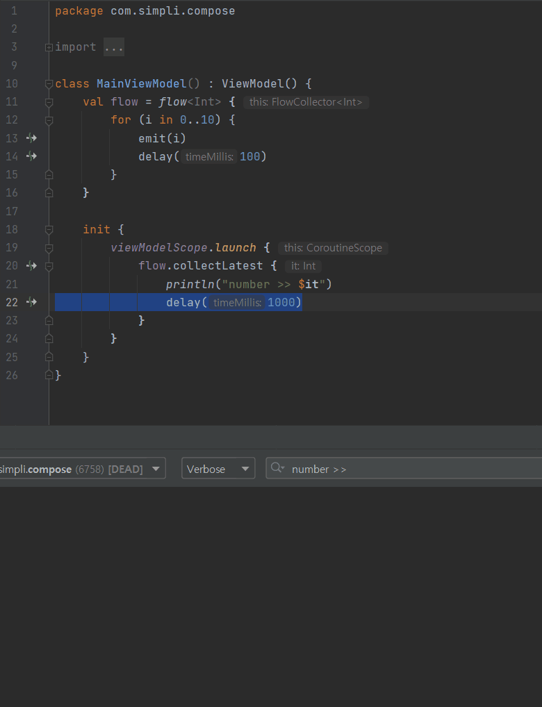 이러한 특성으로 인해 collectLatest는 항상 최신 데이터를 소비한다. 그림4의 코드를 collectLatest로 변경하면 collectLatest에서 delay를 주더라도 delay도중 취소되고 새로운 데이터로 발행되어 1초만에 모든 작업이 완료되는 것을 확인할 수 있다.