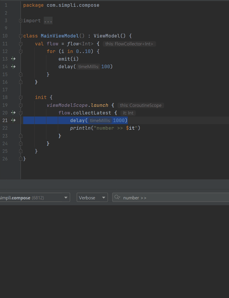 이러한 특성으로 인해 collectLatest는 항상 최신 데이터를 소비한다. 그림4의 코드를 collectLatest로 변경하면 collectLatest에서 delay를 주더라도 delay도중 취소되고 새로운 데이터로 발행되어 1초만에 모든 작업이 완료되는 것을 확인할 수 있다.
