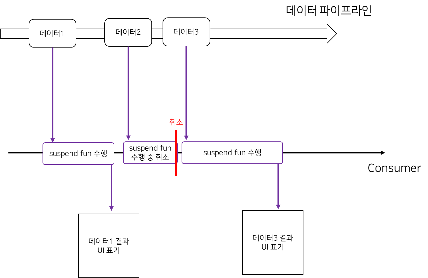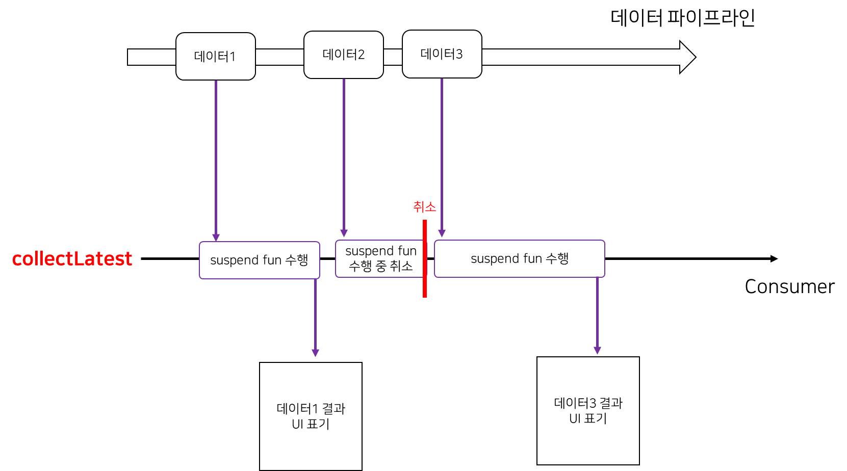 위 문제를 처리하는 가장 간단한 방법은 그림2와 같이 최신 데이터가 들어왔을 때 이전 데이터를 이용해 수행하던 suspend fun을 취소하고 새로 들어온 데이터로 suspend fun을 수행하도록 만드는 것이다. 그렇게하면 최신 데이터가 들어왔을 때 최신 데이터를 처리한 결과만을 화면에 빠르게 표기할 수 있게 해준다.