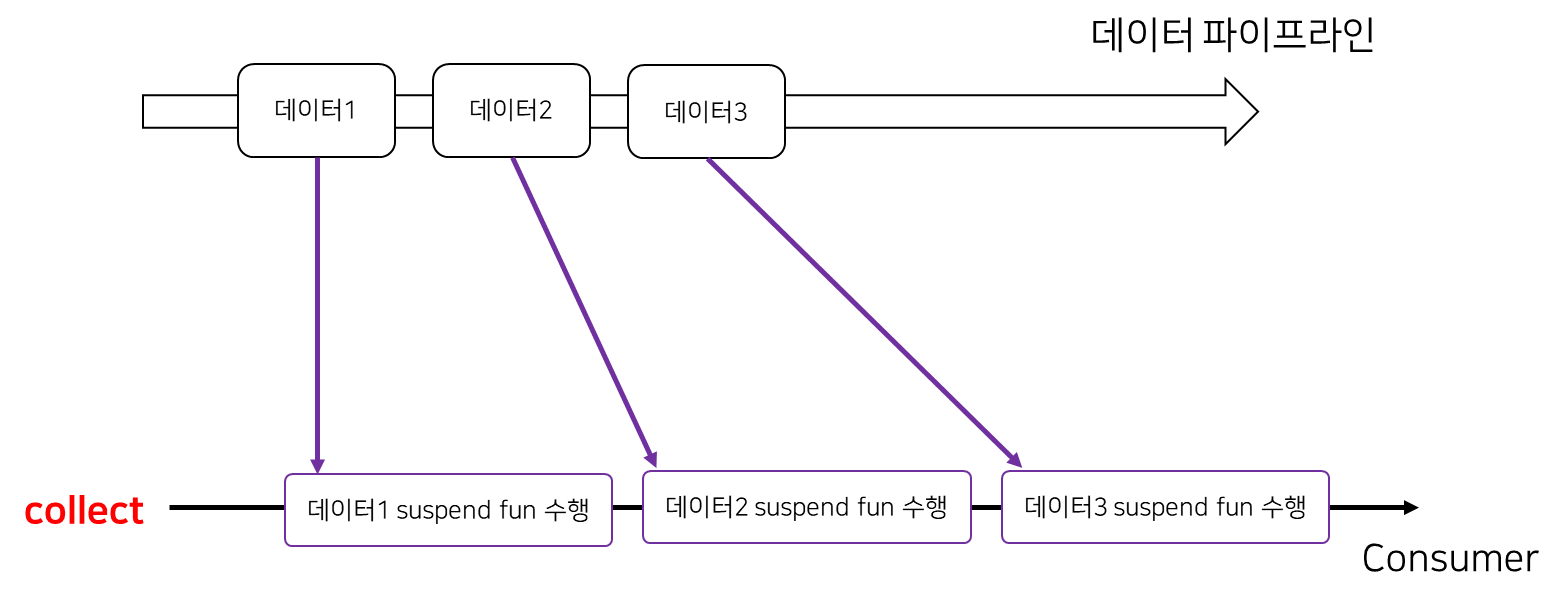 collect의 인자로 들어가는 action 블록은 flow에서 발행된 데이터를 순차적으로 받아 suspend fun을 수행한다.