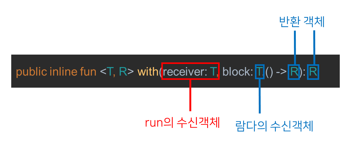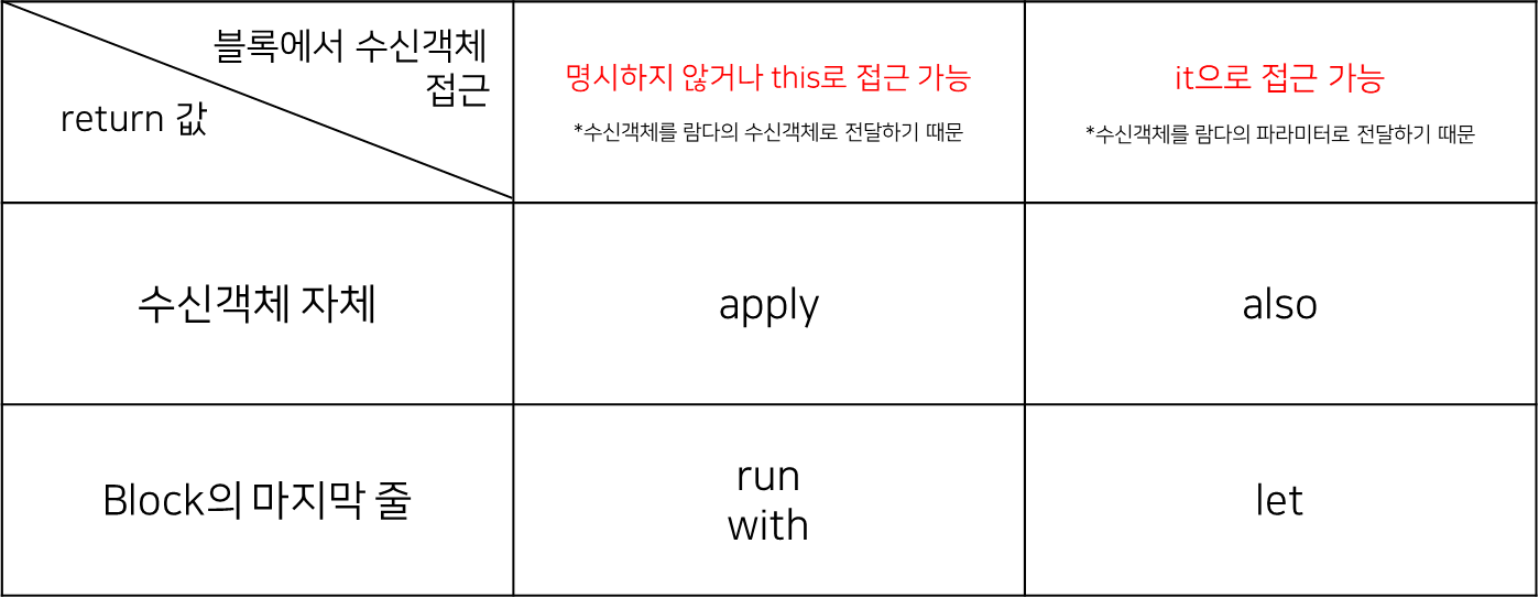 범위 지정함수는 다른 말로 수신객체 지정 람다(함수)라고도 부른다. 이유는 수신객체를 명시하지 않거나 it을 호출하는 것만으로 람다 안에서 수신객체의 메서드를 호출할 수 있도록 해주기 때문이다. 이것이 가능한 이유는 블록(block) 람다식에서 수신객체를 람다의 입력 파라미터 혹은 수신객체로 사용하였기 때문이다.
