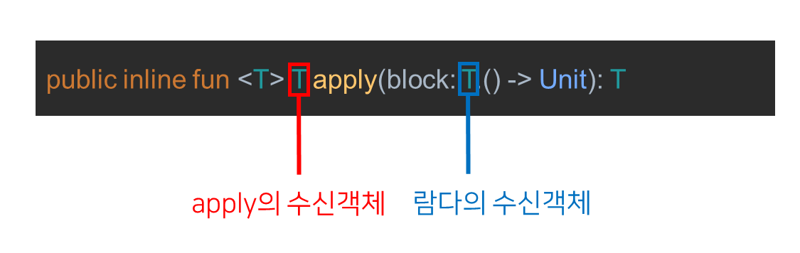 apply에서의 block은 람다식의 수신객체로 apply의 수신객체(T)를 지정하기 때문에 람다식 내부에서 수신객체에 대한 명시를 하지 않고 함수를 호출할 수 있게 된다.