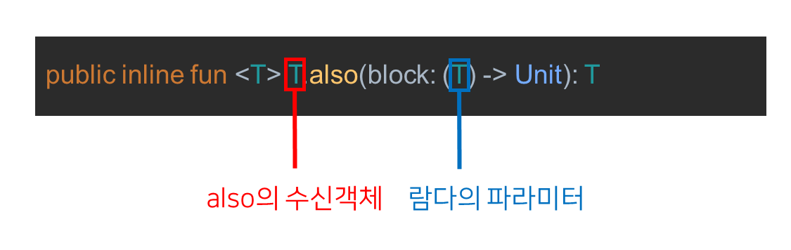 also에서의 block은 람다식의 입력 파라미터로 also의 수신객체(T)를 지정한다.