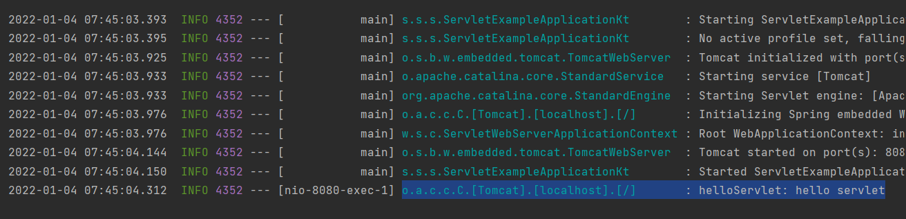 - service에서 log를 사용하며 "/hello"로 접근했을 때 "hello servlet"을 출력하도록 한다.