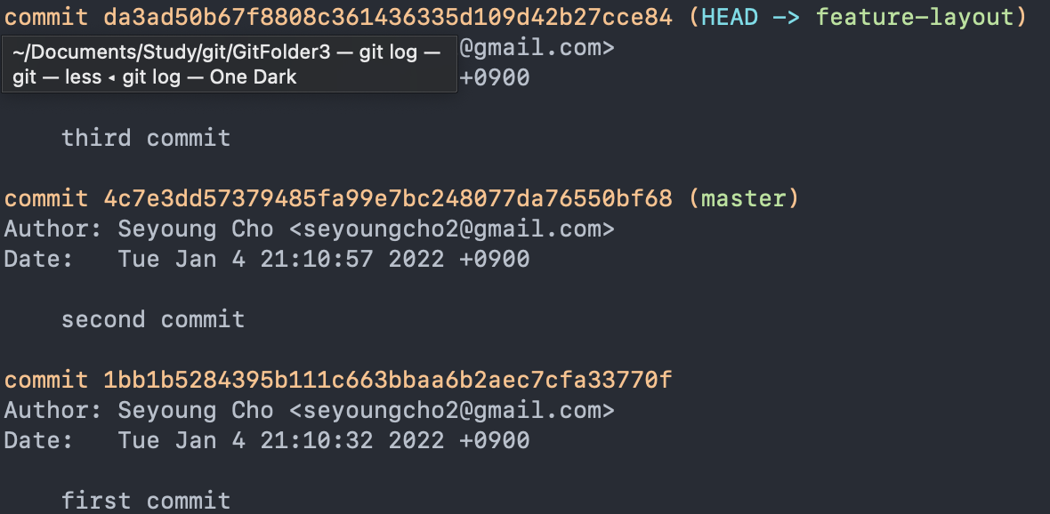브랜치를 새로 만들게 되면 이전 master의 commit들이 그대로 새로운 branch의 commit이 된다. 그렇게 되면 master branch의 마지막 커밋은 feature-layout branch의 마지막 커밋이 되며 feature-layout branch의 HEAD가 된다.