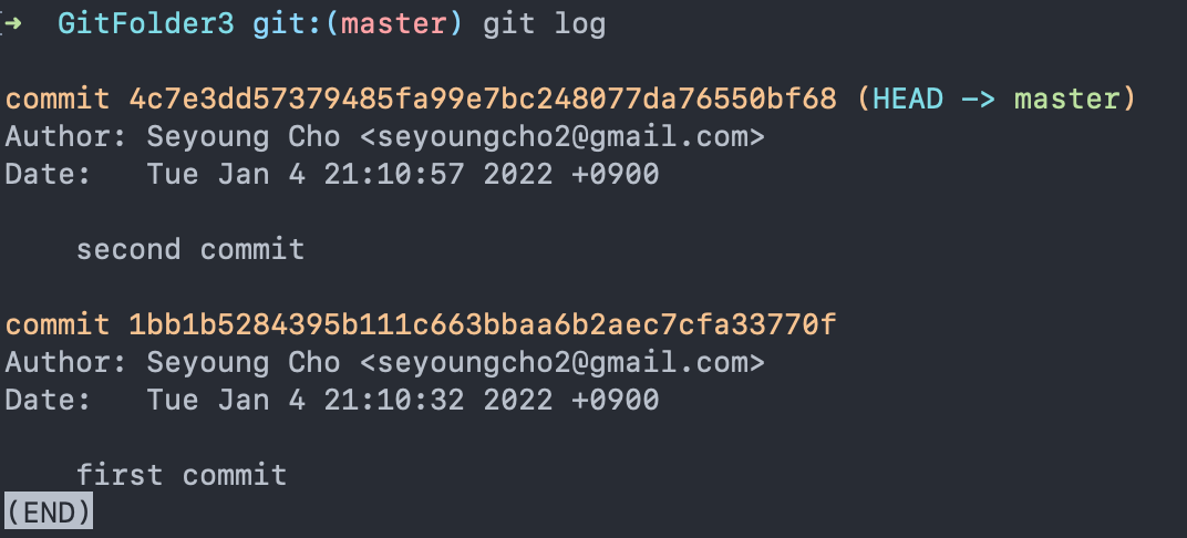 HEAD는 항상 현재 브랜치의 최신 커밋을 포인팅한다. 그 외의 브랜치의 최신 커밋은 커밋 해시 뒤에 ([branch name]) 으로 표기된다.