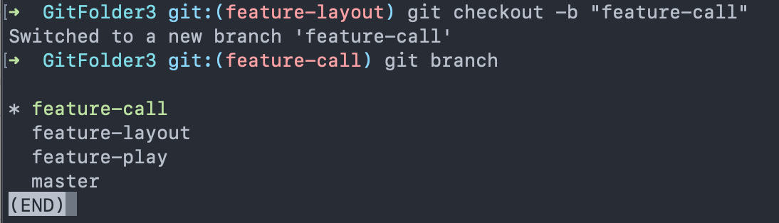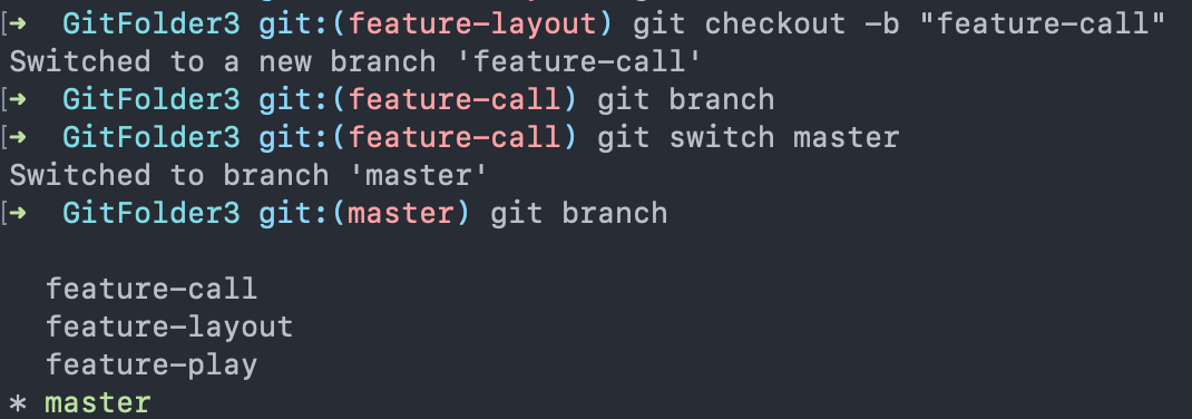 이 명령어는 브랜치가 없을 때는 브랜치를 생성해주고 전환하며 브랜치가 있을 때는 브랜치를 전환한다. 예를 들어 "feature-call"이라는 브랜치를 생성과 전환을 동시에 하고 싶다면 다음의 명령어를 사용하면 된다.
