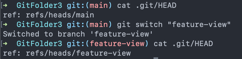 예를 들어 main 브랜치에서 .git/HEAD를 확인할 때는 이 값은 "ref: refs/heads/main" 이 된다 하지만 feature-view 브랜치에서 .git/HEAD를 확인하면 이 값은 "ref: refs/heads/feature-view" 가 된다.