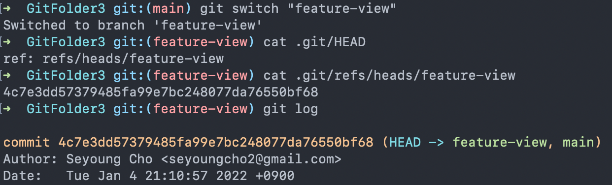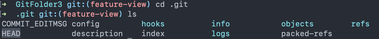 예를 들어 feature-view의 head hash값을 저장하는 ".git/refs/heads/feature-view" 를 cat 하면 해시 값이 "