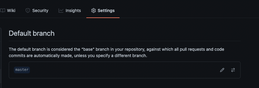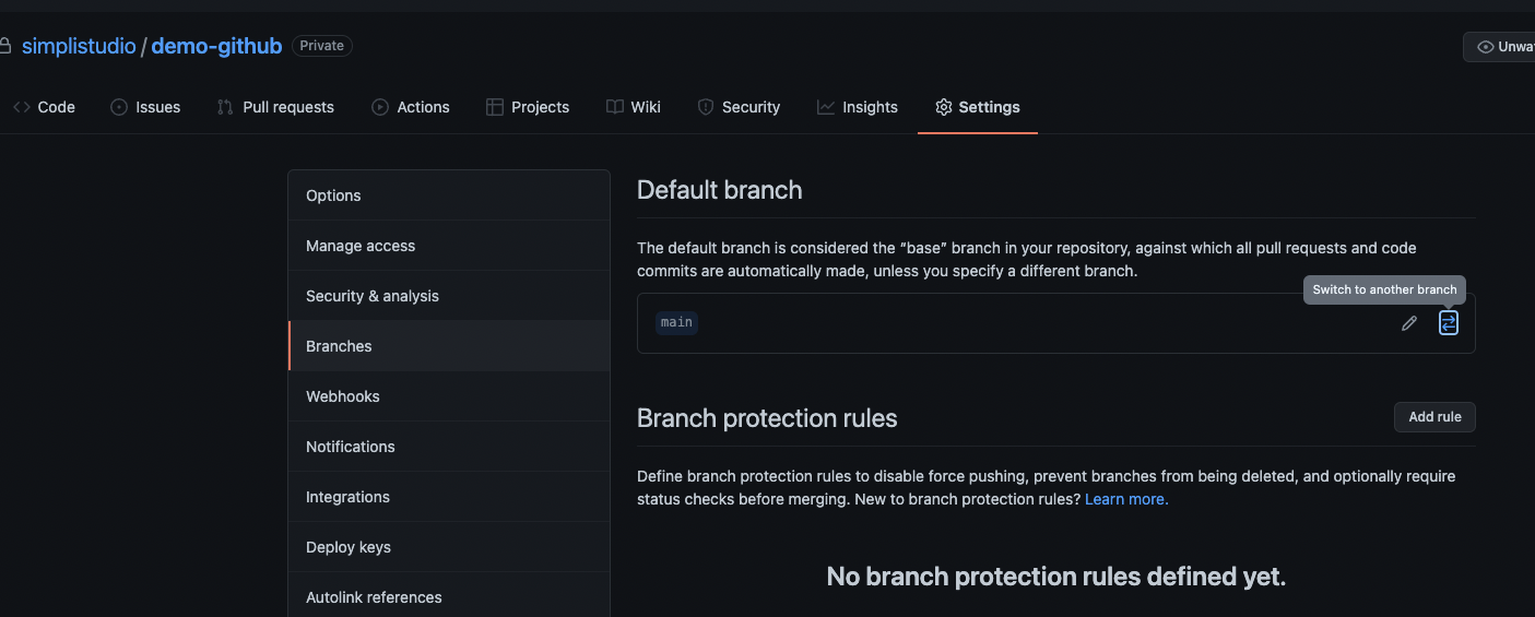 3. GitHub Repository-Settings-Branches-Default 브랜치에 들어가 Switch to another branch 버튼을 누른다.