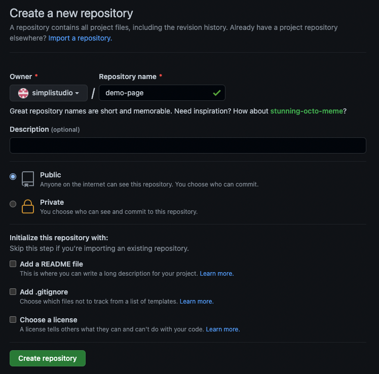 1. https://github.com/new 에서 저장소를 새로 만든다. 이 글에서는 저장소 이름을 demo-page라 한다.