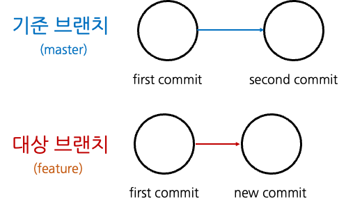 예를 들어 다음과 같이 기준 브랜치와 대상 브랜치 사이에 분기가 일어났다고 해보자.