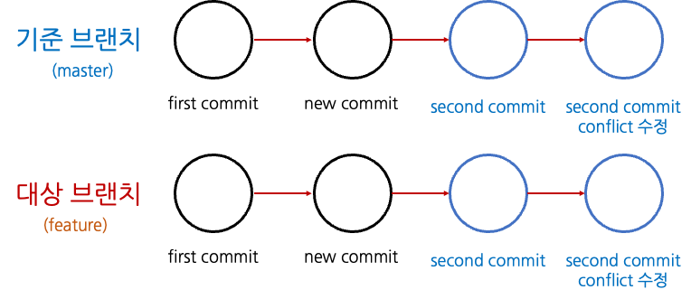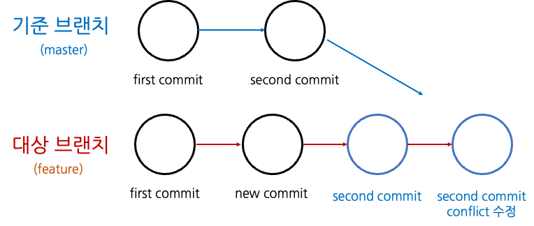 만약 git merge를 하게 되면 [그림2]와 같이 기준 브랜치의 변경사항(커밋)을 합치는 식으로 머지가 일어나게 된다. 즉, 기준 브랜치의 second commit이 대상 브랜치의 second commit으로 온다. 수행하던 중 conflict이 일어난 경우 해당 conflict이 해결된 버전이 대상 브랜치의 새로운 커밋이 된다.