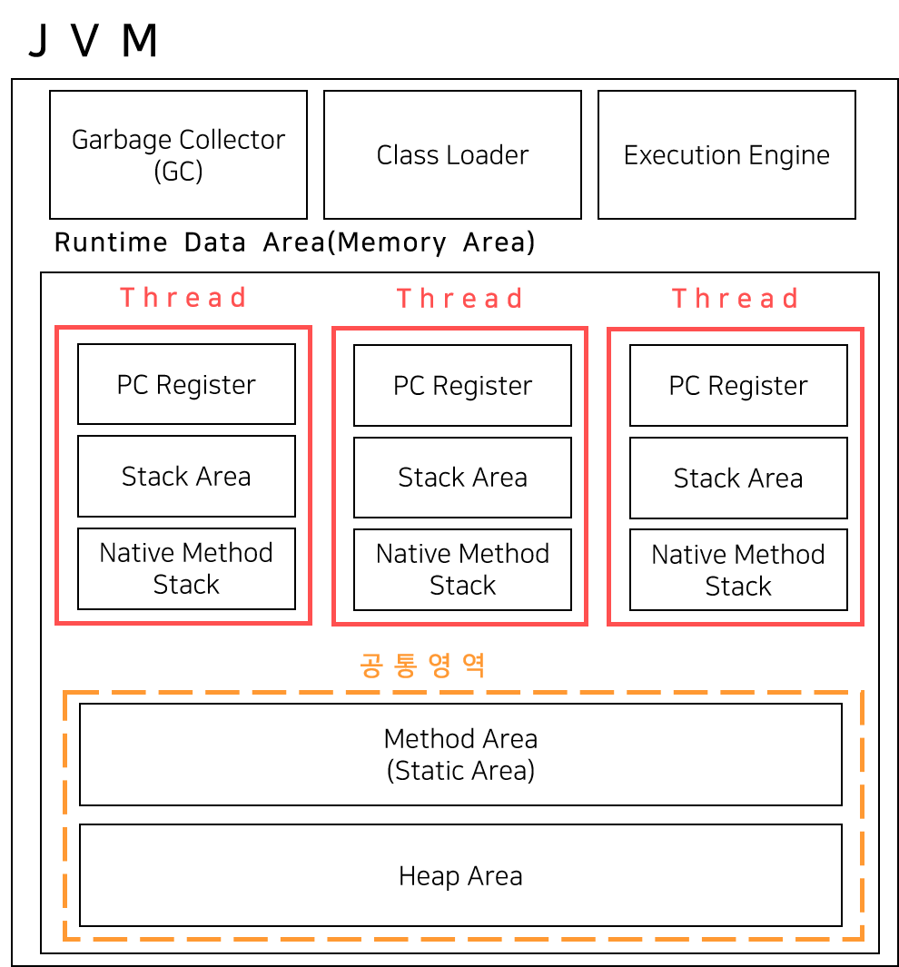 JVM은 Runtime에 Data를 올려놓는 공간인 Runtime Data Area를 가지고 있다. 이 공간은 총 5가지로 나뉘는데, 뒤의 PC Register과 Native Method Stack 영역은 Low Level의 Operation을 하기 위한 메모리 공간 이므로 이 장에서는 앞의 세가지 'Method Area(Static Area)', 'Heap Area', 'Stack Area'만 다룬다.