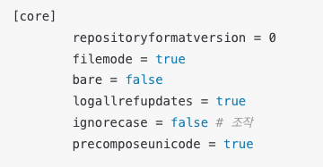 parameter은 category 아래에 있는 [parameter] = [value] 쌍에서 왼쪽에 있는 값이다. [그림1] 에서는 epositoryformatversion, filemode, bare, logallrefupdates, ignorecase, precomposeunicode 가 파라미터이다. value는 해당 파라미터에 대응되는 값이다.