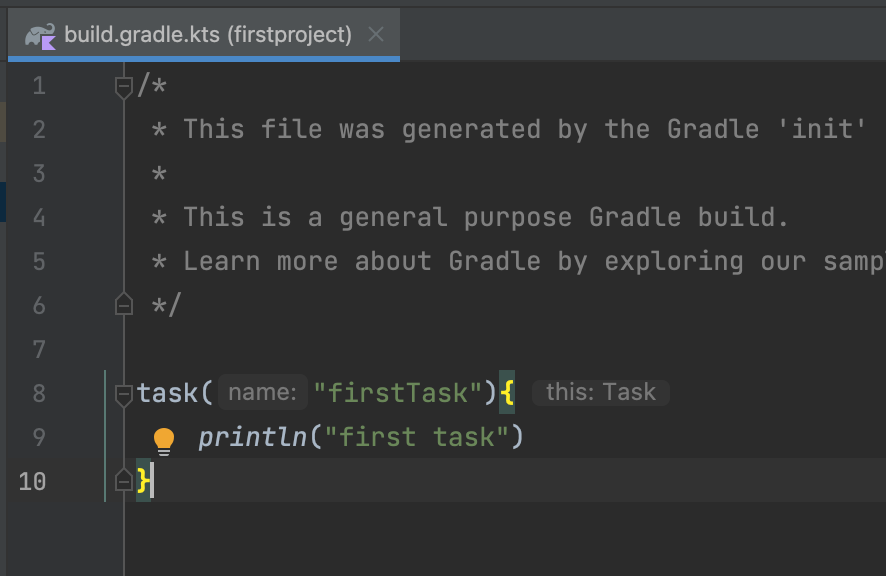 2. build.gradle.kts를 열어 다음 task를 작성한다. 이 task는 first task를 프린트하는 간단한 task이다.
