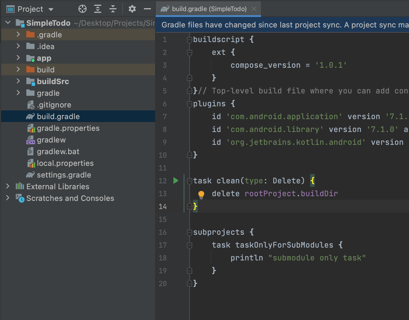 그렇게 되면 서브모듈인 app 모듈의 build.gradle에 위 taskOnlyForSubModules task가 들어간다.