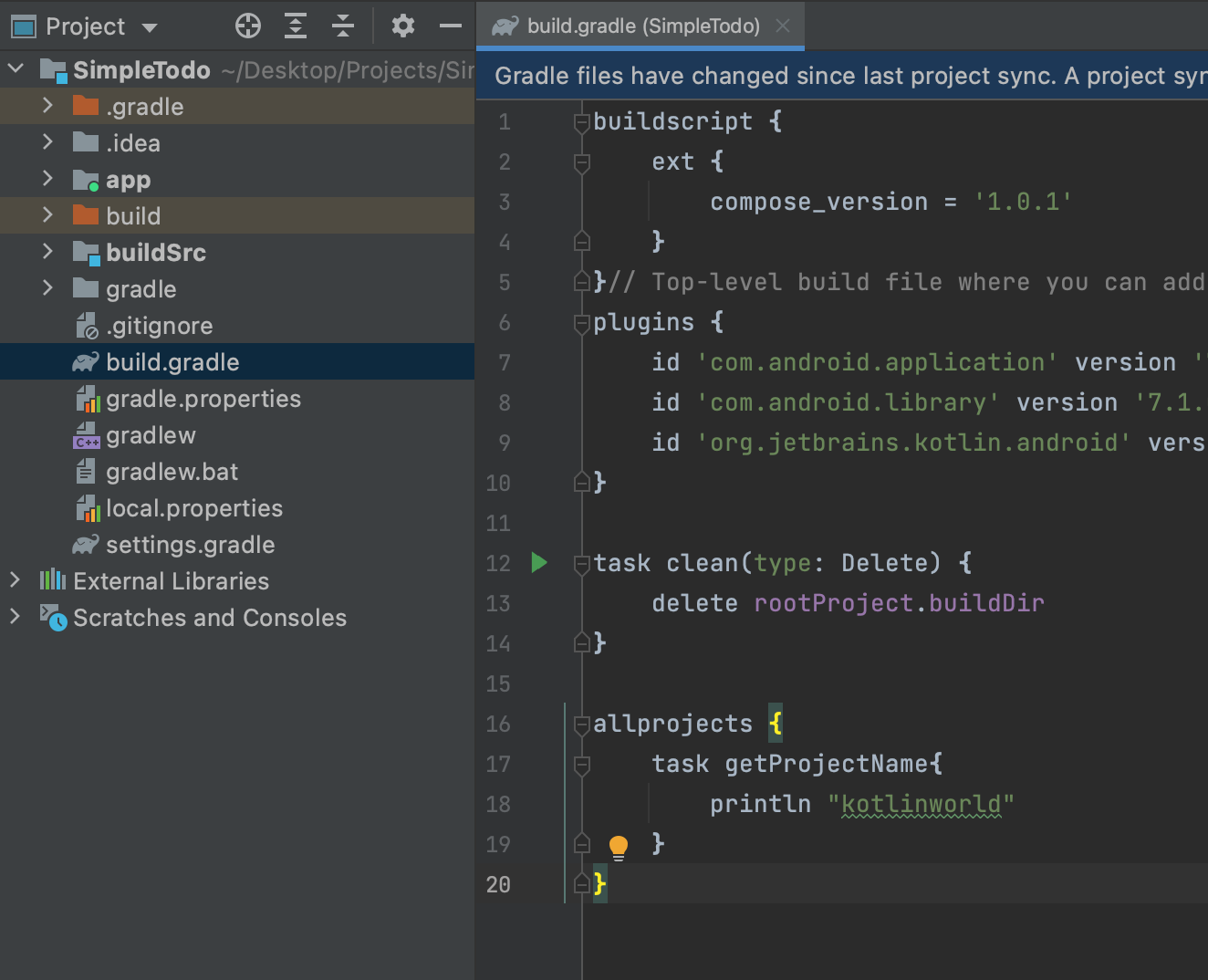 실제 적용 화면은 다음과 같다. printProjectName task는 SimpleTodo 프로젝트 뿐만 아니라 내부의 모듈인 app 모듈에도 적용된다.
