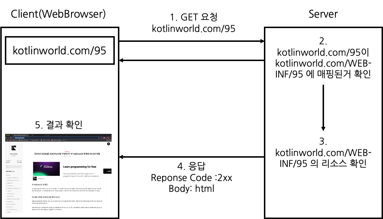 예를 들어 [그림2]와 같이 kotlinworld.com/95를 서버에 요청했는데, 서버에서 해당 글의 리소스가 kotlinworld.com/WEB-INF/95에 있음을 확인한 경우, kotlinworld.com/WEB-INF/95를 리소스를 확인하여 클라이언트에 응답하게 된다. 이 과정에서 클라이언트가 요청한 kotlinworld.com/95는 바뀌지 않고 요청 정보가 그대로 유지된다, 클라이언트 또한 포워딩이 일어났는지 조차 알지 못한다.