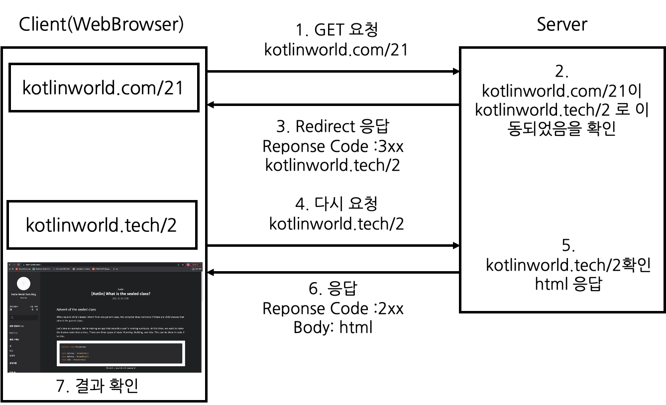 예를 들어 [그림1]과 같이 클라이언트에서 kotlinworld.com/21를 서버에 요청했는데, 서버에서 해당 글이 kotlinworld.tech/2로 이동되었음을 확인한 경우 kotlinworld.tech/2로 리다이렉션을 명령하게 된다. 그러면 클라이언트는 다시 kotlinworld.tech/2를 요청하며, 서버는 해당 url 값의 html 문서를 리턴해 클라이언트에서 해당 문서를 확인할 수 있게 된다. 이때 웹브라우저 주소창의 kotlinworld.com/21이 kotlinworld.tech/2로 바뀌게 되어 클라이언트는 리다이렉션이 일어났음을 인지할 수 있다.