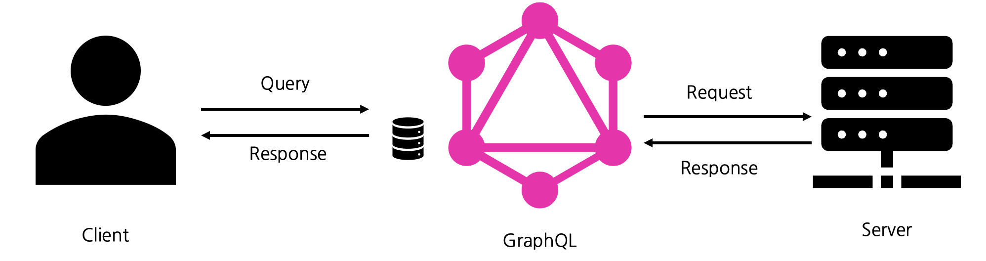 클라이언트에서 쿼리를 선언하면 데이터를 절차적으로 처리하는 것은 누가 하는가? SQL은 RDB가 해당 역할을 수행하는데 GraphQL은 도대체 누가 그 역할을 할까? 바로, 서버와 클라이언트 사이에 GraphQL이라는 Service Broker 레이어가 더 들어가고 이 GraphQL에서 절차적으로 처리를 수행한다. 즉, GraphQL을 사용하기 위해서는 서버와 클라이언트의 중간에 GraphQL이 레이어로 하나 더 있다고 보아야 한다. 클라이언트는 서버를 알 필요가 없이 GraphQL 레이어랑만 통신함으로써 데이터를 가져오는 것이다. 즉, 기존에 클라이언트에서 데이터를 조합하던 역할이 GraphQL로 옮겨지는 것이다.